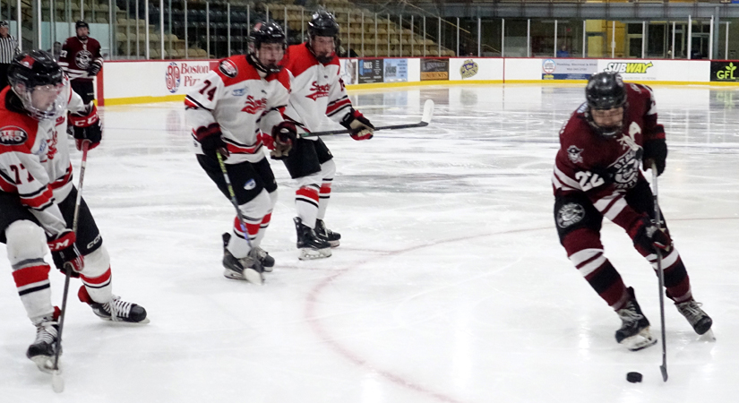 Strait Pirates leading scorer Landon MacIntosh, of Cheticamp, gathers an audience of Pictou County players as he demonstrates how to score top shelf on a backhander in Friday’s 8-4 win at the Port Hawkesbury Civic Centre.