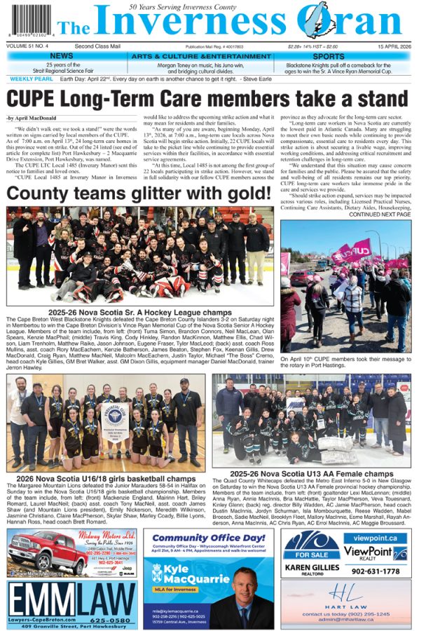 Readers can take advantage of a flexible subscription package available for 3-months, 6-months or 12-months periods, available in a Print Version, a Digital Version, or both. First published in 1976, The Inverness Oran continues to serve and reflect residents and communities of Inverness County.