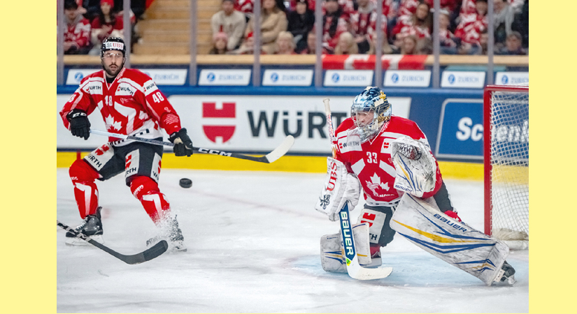 Colten Ellis faced 44 shots in the Spengler Cup semifinal against Straubing and finished the tournament with a .911 save percentage. He’s shown here making a save with defenceman Jonathan Aspirot looking on.