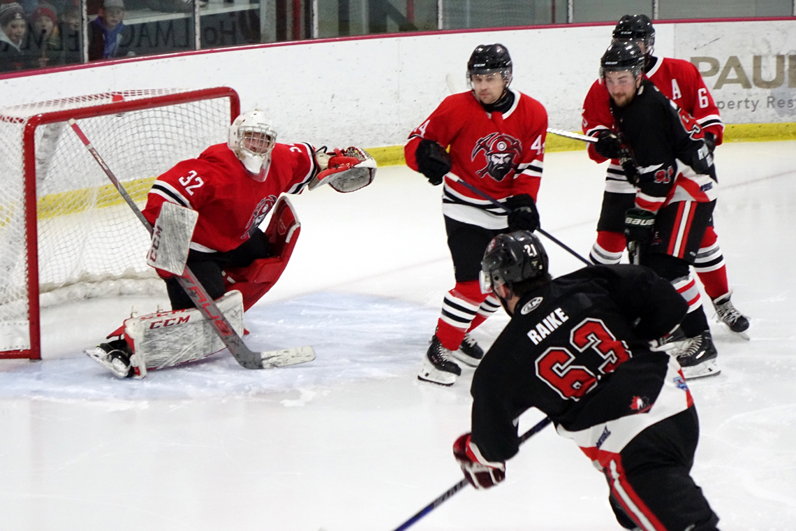 Cape Breton West Blackstone Knights forward Matt Raike takes a shot on Glace Bay Miners goaltender Hunter Chenhall during their Nova Scotia Senior A Hockey League playoff series. Game three of the best-of-five series goes this Friday, 8 p.m., at the Dr. Bernie MacLean Cultural and Recreation Centre in Inverness.