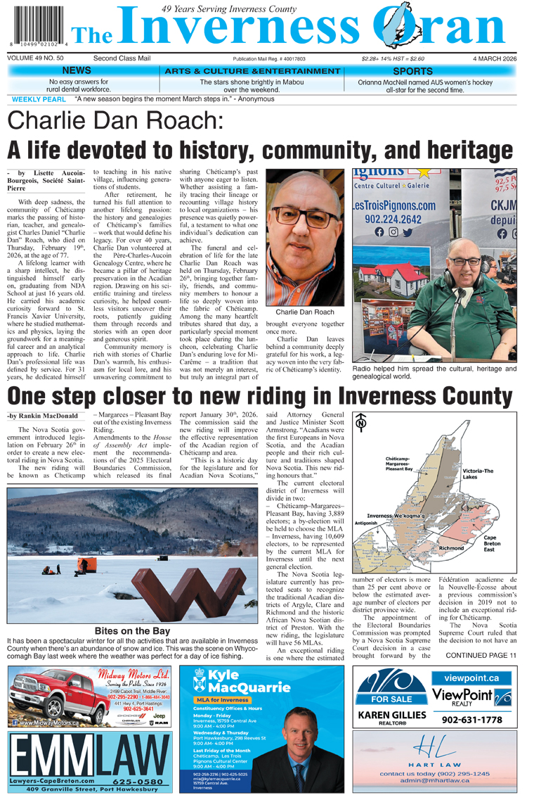 Readers can take advantage of a flexible subscription package available for 3-months, 6-months or 12-months periods, available in a Print Version, a Digital Version, or both. First published in 1976, The Inverness Oran continues to serve and reflect residents and communities of Inverness County.