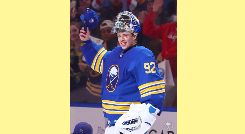 Colten Ellis was named the game’s first star when he made his goaltending debut with the Buffalo Sabres on Oct. 22, making 27 saves to win his first NHL game 4-2. (Photo courtesy of the Buffalo Sabres)